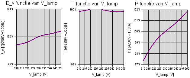 De verlichtingssterkte, het opgenomen vermogen en de kleurtemperatuur zijn (bijna) niet afhankelijk van een verandering van de netspanning. Dit is prettig want je behoudt de intensiteit en kleur van het licht.