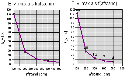 De verlichtingssterkte als functie van de afstand