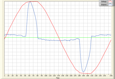 De stroom is in fase met de spanning, echter de stroom is gepiekt. Dit is heel normaal is voor kleine voedingen die in de lamp zijn gebouwd; het zijn de laadstromen van de condenstor die deel uitmaakt van de interne voedingsunit. Deze condensator zorgt voor een stabiele spanning voor de leds die eruit gevoed worden. De stroomvorm is daarmee niet gelijkvormig aan de spanningsvorm, en vandaar dat de powerfactor ook lager dan 1 is.