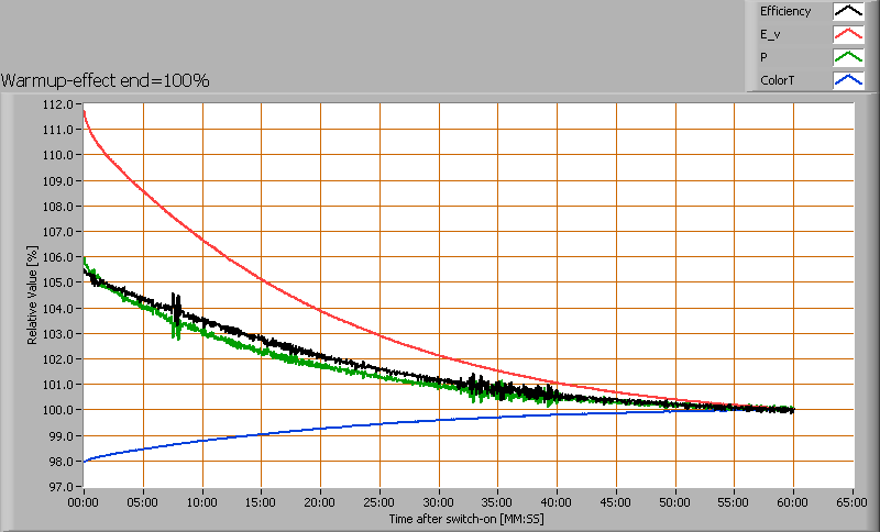 Het opwarmen duurt iets meer dan een uur en in die tijd is de verlichtingssterkte 11 % afgenomen.