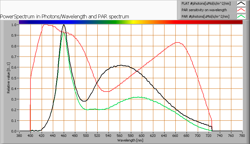 Het vermogensspectrum (vermogen per golflengte) van het licht van de lamp wordt dus eerst omgerekend naar het aantal fotonen (aantallen lichtdeeltjes per golflengte) waarna deze aantallen fotonen per golflengte nog gewogen worden tegen de gevoeligheid van de gemiddelde plant ervoor (volgens DIN-norm 5031-10:2000). Het volgende plaatje laat het resultaat zien.