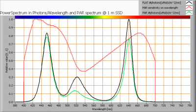 Het vermogensspectrum (vermogen per golflengte) van het licht van de lamp wordt dus eerst omgerekend naar het aantal fotonen (aantallen lichtdeeltjes per golflengte) waarna deze aantallen fotonen per golflengte nog gewogen worden tegen de gevoeligheid van de gemiddelde plant ervoor (volgens DIN-norm 5031-10:2000). Het volgende plaatje laat het resultaat zien.