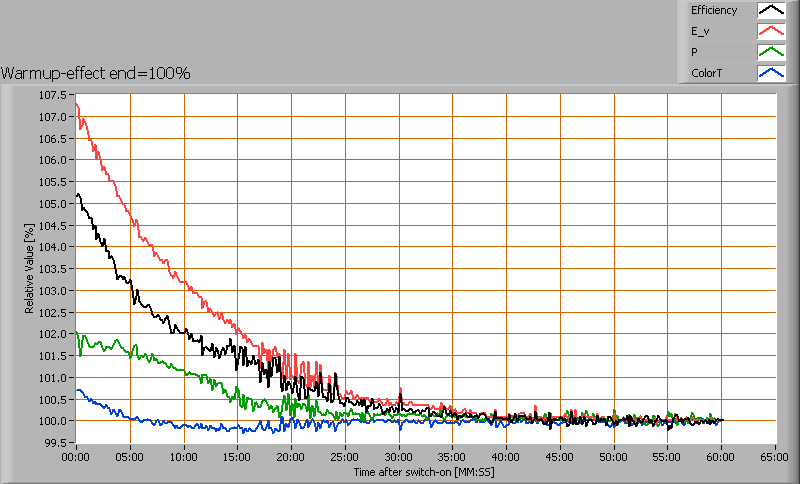 De opwarmtijd is ongeveer 25 minuten, daarna veranderen de lampparameters niet (significant) meer.