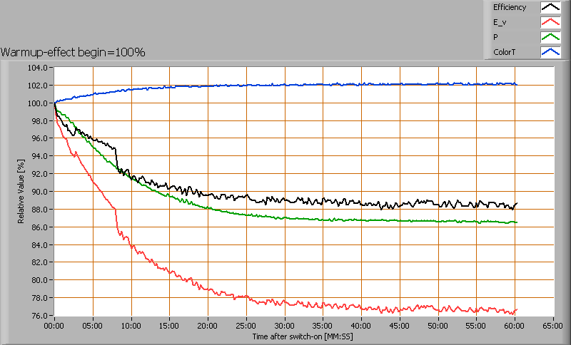 De opwarmtijd is ongeveer 25 minuten, daarna veranderen de lampparameters niet (significant) meer.