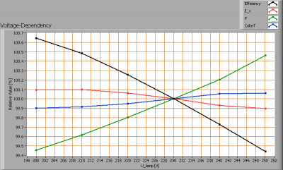 Opwarmeffect: gedurende de opwarming neemt de verlichtingssterkte af met 7 % en het opgenomen vermogen neemt af met 2 %. Spanningsafhankelijkheid: er is geen noemenwaardige afhankelijkheid van lampparameters bij variatie van de voedingsspanning. |