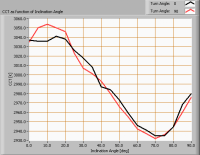 De kleurtemperatuur is gegeven voor kantelhoeken tot 90 graden, daarna is niet meer gemeten.
