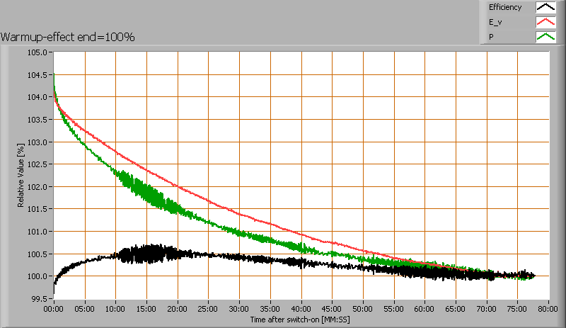 De warmup tijd is ongeveer 45 minuten. Gedurende de opwarming neemt de verlichtingssterkte af met ongeveer 4 % en het opgenomen vermogen met ongeveer 5 %.