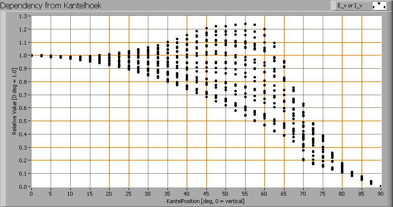 Deze plot geeft grafisch weer welke verschillende meetwaarden verkregen zijn bij iedere kantelhoek. Voor een bepaalde kantelhoek zijn er zo een aantal metingen, die afkomstig zijn van verschillende draaihoeken rondom de lamp.