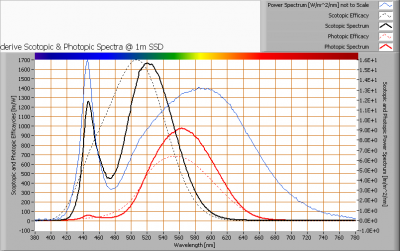 Het vermogensspectrum, de gevoeligheidscurven en de resulterende nacht – en dagspectra (laatste op 1 m afstand).