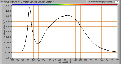 Het kleurspectrum van het licht van deze lamp. Energieniveaus geldig op 1 m afstand.