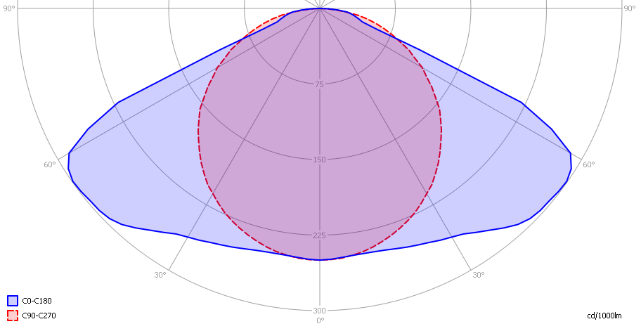 Het lichtdiagram geeft de bundel aan in het C0-C180 vlak (loodrecht op de lengterichting van de lamp) en de bundel in het C90-C270 vlak (in de lengterichting van het lichtgevende oppervlak, gelijk aan in de lengterichting van de lamp).