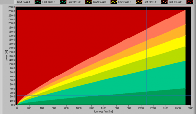 Met de meting van de lichtstroom en het opgenomen vermogen is de classificatie te geven van deze lamp. Dit wordt voor een aantal lampen verplicht gesteld in de EU, zie ook de OliNo site waar uitleg staat voor welke lampen het geldt, hoe het label eruit ziet en wat het moet bevatten aan informatie.