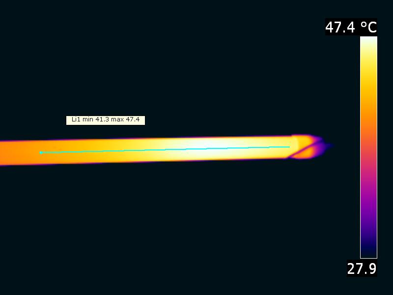 De lamp wordt maximaal ongeveer 23 graden warmer dan omgevingstemperatuur. Opwarmeffect: Gedurende de opwarming varieert de verlichtingssterkte gedurende 16 minuten en neemt dan 6 % af. Afhankelijkheid spanning: Er is geen (significante) afhankelijkheid van de verlichtingssterkte wanneer de voedingsspanning tussen de 200 – 250 V AC varieert. Aan het eind van het artikel een extra foto. |