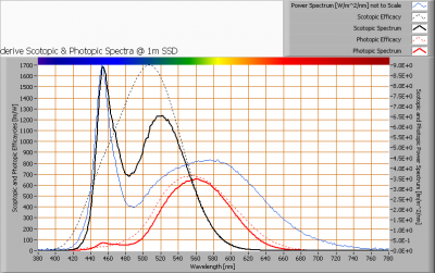 Het vermogensspectrum, de gevoeligheidscurven en de resulterende nacht – en dagspectra (laatste op 1 m afstand).
