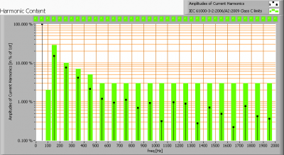 De harmonischen van de stroom uitgezet tegen de eisen voor harmonischen vanuit IEC61000-3-2:2006 A2:2009