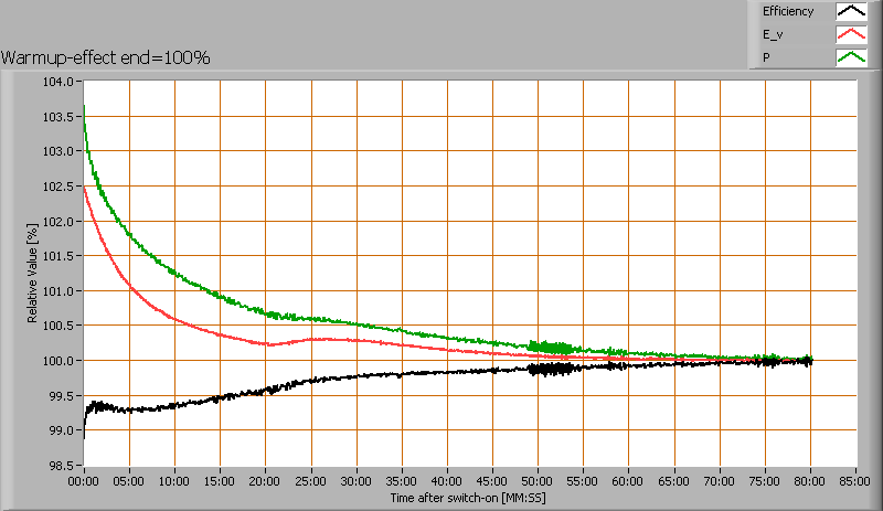 Van deze lamp zijn de opwarm-effecten doorgemeten op de verschillende interessante parameters. Zie ook de grafiek.