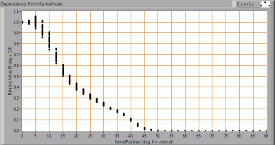 Deze plot geeft grafisch weer welke verschillende meetwaarden verkregen zijn bij iedere kantelhoek. Voor een bepaalde kantelhoek zijn er zo een aantal metingen, die afkomstig zijn van verschillende draaihoeken rondom de lamp.