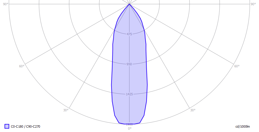 Het lichtdiagram geeft een bundel aan in het C0-C180 vlak en in het 90 graden loodrecht daarop staande C90-C270 vlak. Deze zijn gelijk vanwege de symmetrie over de 1e as (de verticale as).