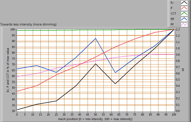 Van deze lamp zijn de opwarm-effecten doorgemeten op de verschillende interessante parameters. Zie ook de grafiek.