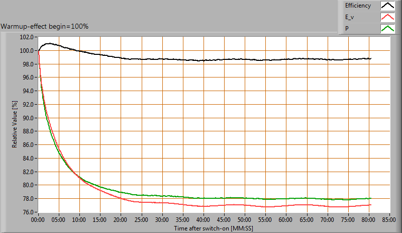 De variatie in efficiëntie door het opwarmen is -1 %. Een erg hoog negatief getal duidt op een significante afname door bijvoorbeeld warm worden van de lichtbron (lagere levensduur).