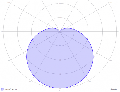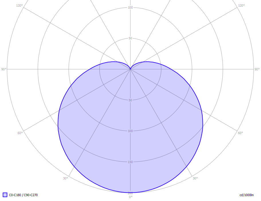 Het lichtdiagram geeft een bundel aan in het C0-C180 vlak en in het 90 graden loodrecht daarop staande C90-C270 vlak. Deze zijn gelijk vanwege de symmetrie over de 1e as (de verticale as).