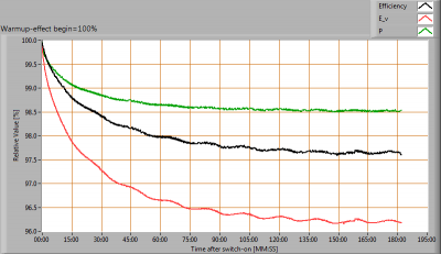 De variatie in efficiëntie (hier indicatief berekend door deling van verlichtingssterkte door vermogen) door het opwarmen is -2 %. Een erg hoog negatief getal duidt op een significante afname door bijvoorbeeld warm worden van de lichtbron (lagere levensduur).