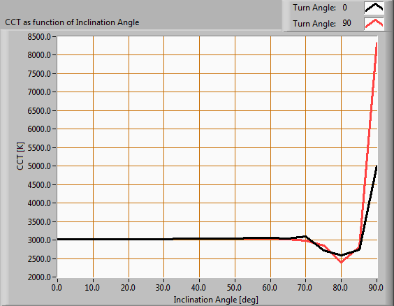 Voor het C0-C180 vlak: kijkende naar de stralingshoek van 72 graden dan komt dit overeen met 35.8 graden kantelhoek, dit is het gebied waar het meeste van het licht afgegeven wordt. De maximale variatie in kleurtemperatuur in de eerste 90 graden van dit gebied (kantelhoek) is ongeveer 1 %.