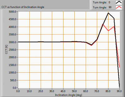 Voor het C0-C180 vlak: kijkende naar de stralingshoek van 60 graden dan komt dit overeen met 29.8 graden kantelhoek, dit is het gebied waar het meeste van het licht afgegeven wordt. De maximale variatie in kleurtemperatuur in de eerste 90 graden van dit gebied (kantelhoek) is ongeveer 0 %.