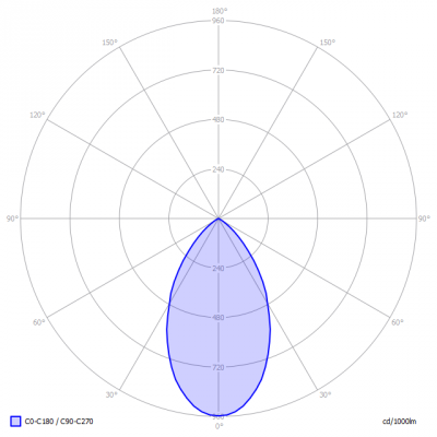 Het lichtdiagram geeft een bundel aan in het C0-C180 vlak en in het 90 graden loodrecht daarop staande C90-C270 vlak. Deze zijn gelijk vanwege de symmetrie over de 1e as (de verticale as).