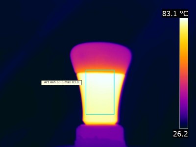 | Algemene opmerkingen | De omgevingstemperatuur gedurende de hele set van verlichtingsterktemetingen was 26.9 – 27.2 deg C.De lamp wordt maximaal ongeveer 56 graden warmer dan omgevingstemperatuur.Opwarmeffect: Gedurende de opwarming varieert de verlichtingssterkte gedurende 41 minuten en neemt dan 13 % af. Gedurende de opwarming varieert het vermogen niet significant (< 5 %). De variatie in efficiëntie (hier indicatief berekend door deling van verlichtingssterkte door vermogen) door het opwarmen is -11 %. Een erg hoog negatief getal duidt op een significante afname door bijvoorbeeld warm worden van de lichtbron (lagere levensduur).Afhankelijkheid spanning: Er is geen (significante) afhankelijkheid van de verlichtingssterkte wanneer de voedingsspanning tussen de 200 – 250 V AC varieert. Er is geen (significante) afhankelijkheid van het opgenomen vermogen wanneer de voedingsspanning tussen de 200 – 250 V AC varieert.Van deze lamp is ook de dimbaarheid onderzocht en de lamp is dimbaar, zie ook het aparte hoofdstuk.Aan het eind van het artikel een extra foto. |