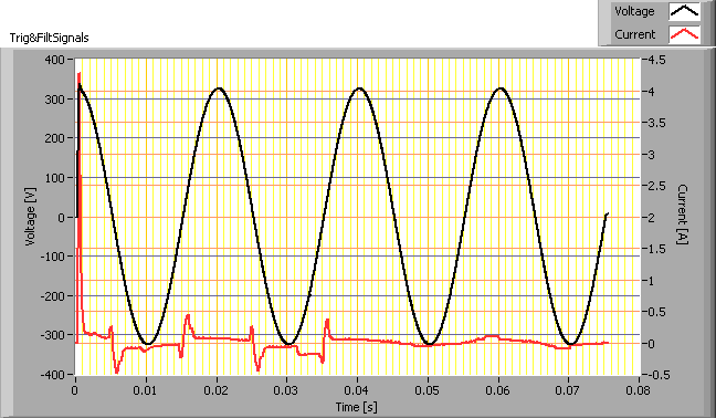 De inschakelstroom is gemeten voor de verschillende starthoeken van de spanning van 0 – 170 graden (met stap van steeds 10 graden). De stroom- en spanningswaardes zijn met een acquisitiefrequentie van 39.9 kS/s binnengehaald. Daarna zijn de meetresultaten door een 2e orde 2kHz laagdoorlaat Butterworth filter gehaald. Hiermee worden zeer kortdurende, niet relevante, (stroom)pieken weggefilterd.