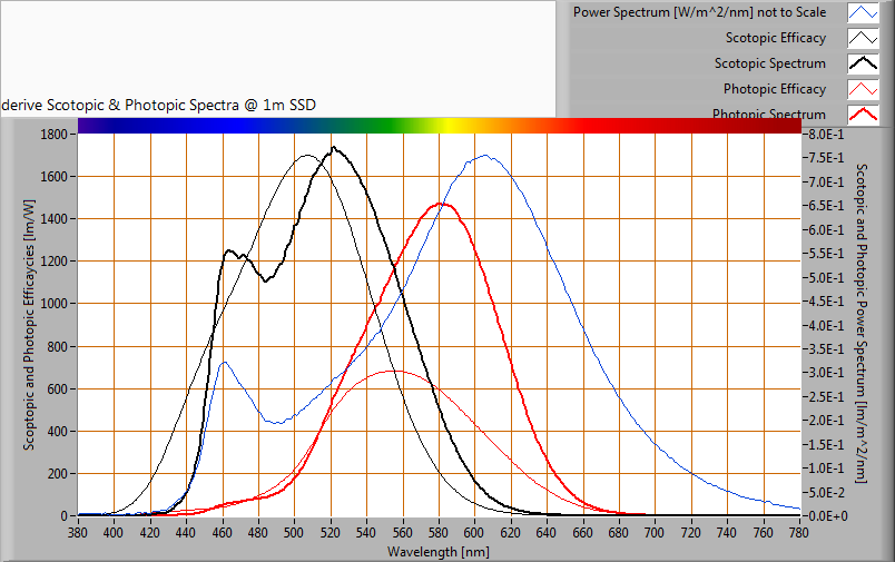 Het vermogensspectrum, de gevoeligheidscurven en de resulterende nacht – en dagspectra (laatste op 1 m afstand).