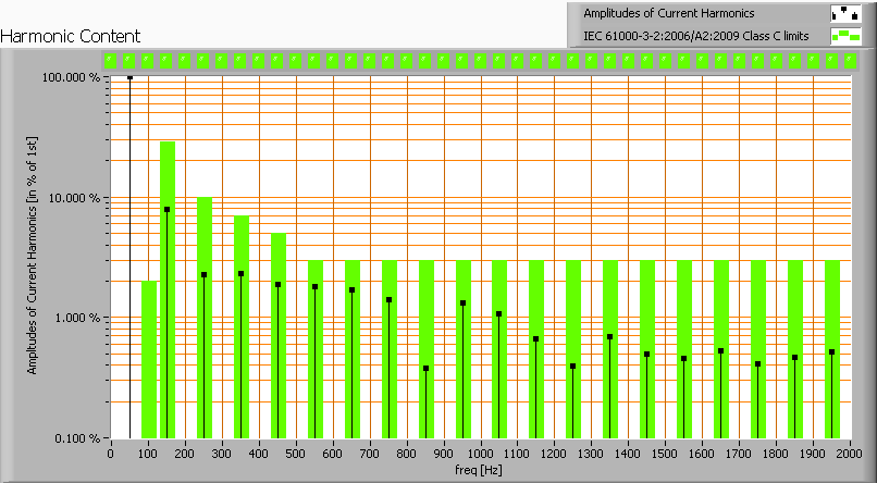 Deze stroom is gechecked tegen de eisen, gesteld door de Europese norm IEC 61000-3-2:2006 met amendement 2:2009 die eisen bevat voor verlichtingsinstallaties <= 25 W en voor > 25 W.