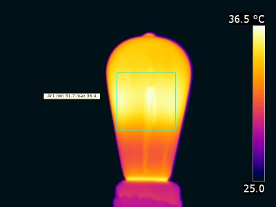 | Algemene opmerkingen | De omgevingstemperatuur gedurende de hele set van verlichtingsterktemetingen was 24.7 – 25.5 deg C.De lamp wordt maximaal ongeveer 11 graden warmer dan omgevingstemperatuur.Opwarmeffect: Gedurende de opwarming varieert de verlichtingssterkte gedurende 2 minuten en neemt dan 6 % af. Gedurende de opwarming varieert het vermogen niet significant (< 5 %). De variatie in efficiëntie (hier indicatief berekend door deling van verlichtingssterkte door vermogen) door het opwarmen is -6 %. Een erg hoog negatief getal duidt op een significante afname door bijvoorbeeld warm worden van de lichtbron (lagere levensduur).Afhankelijkheid spanning: Er is een niet-constante afhankelijkheid van de verlichtingssterkte wanneer de voedingsspanning tussen de 200 – 250 V AC varieert. Er is een constante afhankelijkheid van het opgenomen vermogen wanneer de voedingsspanning tussen de 200 – 250 V AC varieert. Aan het eind van het artikel een extra foto. |