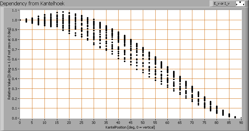 Deze plot geeft grafisch weer welke verschillende meetwaarden verkregen zijn bij iedere kantelhoek. Voor een bepaalde kantelhoek zijn er zo een aantal metingen, die afkomstig zijn van verschillende draaihoeken rondom de lamp.