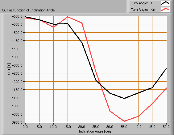 Voor het C0-C180 vlak: kijkende naar de stralingshoek van 32 graden dan komt dit overeen met 15.9 graden kantelhoek, dit is het gebied waar het meeste van het licht afgegeven wordt. De maximale variatie in kleurtemperatuur in dit gebied (kantelhoek) is ongeveer 1 %.
