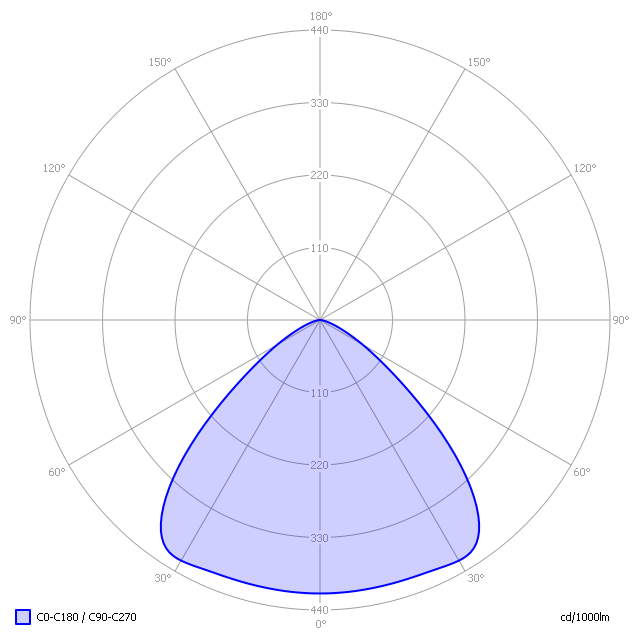 Het lichtdiagram geeft een bundel aan in het C0-C180 vlak en in het 90 graden loodrecht daarop staande C90-C270 vlak. Deze zijn gelijk vanwege de symmetrie over de 1e as (de verticale as).