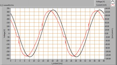 De inschakelstroom is gemeten voor de verschillende starthoeken van de spanning van 0 – 170 graden (met stap van steeds 10 graden). De stroom- en spanningswaardes zijn met een acquisitiefrequentie van 39.9 kS/s binnengehaald. Daarna zijn de meetresultaten door een 2e orde 2kHz laagdoorlaat Butterworth filter gehaald. Hiermee worden zeer kortdurende, niet relevante, (stroom)pieken weggefilterd.
