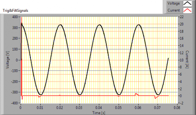 De inschakelstroom is gemeten voor de verschillende starthoeken van de spanning van 0 – 170 graden (met stap van steeds 10 graden). De stroom- en spanningswaardes zijn met een acquisitiefrequentie van 39.9 kS/s binnengehaald. Daarna zijn de meetresultaten door een 2e orde 2kHz laagdoorlaat Butterworth filter gehaald. Hiermee worden zeer kortdurende, niet relevante, (stroom)pieken weggefilterd.