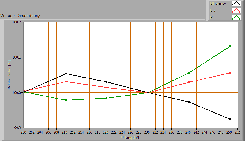 De lamp is onderzocht op hoe afhankelijk de parameters verlichtingssterkte E_v [lx] en het opgenomen netto vermogen P [W] zijn van de lampspanning. Uit de deling van E_v door P volgt een inschatting van de efficiëntie.