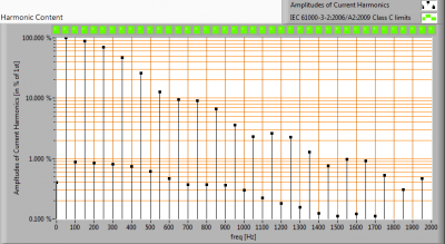 De harmonischen van de stroom uitgezet tegen de eisen voor harmonischen vanuit IEC61000-3-2:2006 A2:2009