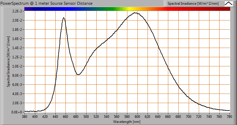 Het kleurspectrum van het licht van deze lamp. Energieniveaus geldig op 1 m afstand.
