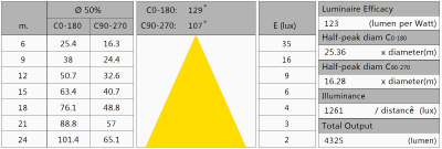 Bij het berekenen van de gemiddelde lichtsterktewaarden per hoek en deze uit te zetten in een grafiek, is de stralingshoek te bepalen: dit is berekend op 129 graden voor het C0-C180 vlak en 107 graden voor het C90-C270 vlak.