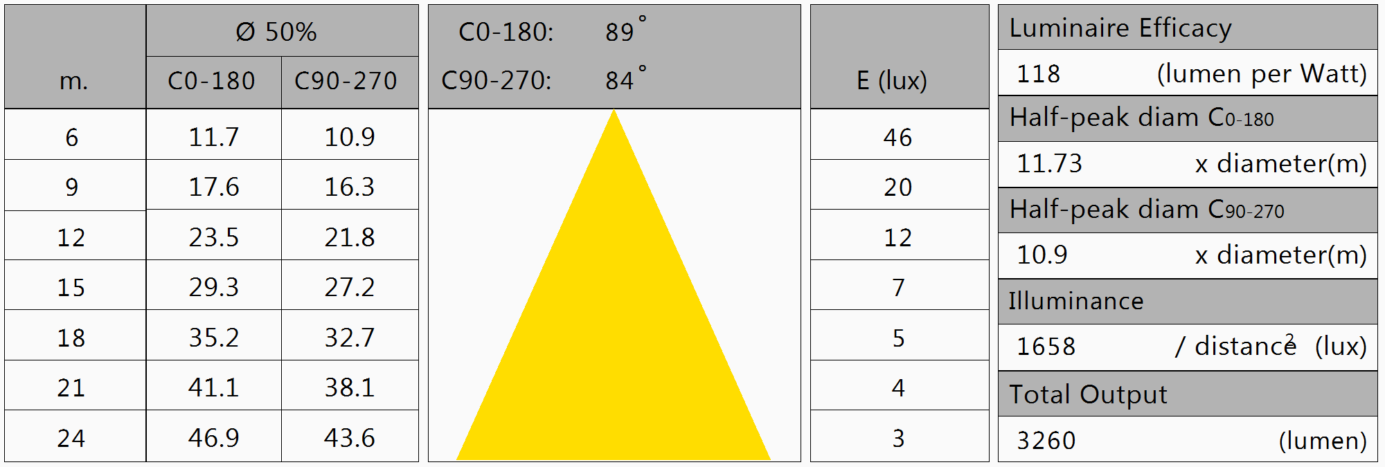 Een lichtstroom van 3260 lm, en een opgenomen vermogen van 27.5 Watt, levert een efficiëntie van 118 lm/Watt.