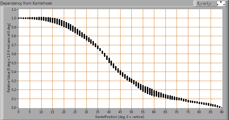 Deze plot geeft grafisch weer welke verschillende meetwaarden verkregen zijn bij iedere kantelhoek. Voor een bepaalde kantelhoek zijn er zo een aantal metingen, die afkomstig zijn van verschillende draaihoeken rondom de lamp.