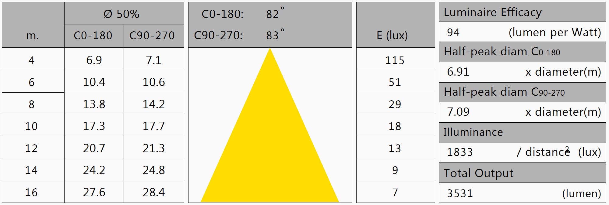 Een lichtstroom van 3531 lm, en een opgenomen vermogen van 37.5 Watt, levert een efficiëntie van 94 lm/Watt.