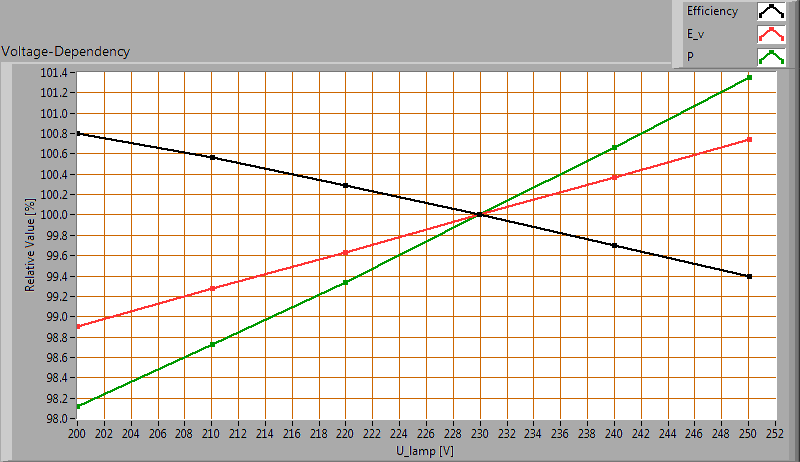 Afhankelijkheid van lampparameters van de ingestelde lampspanning.
