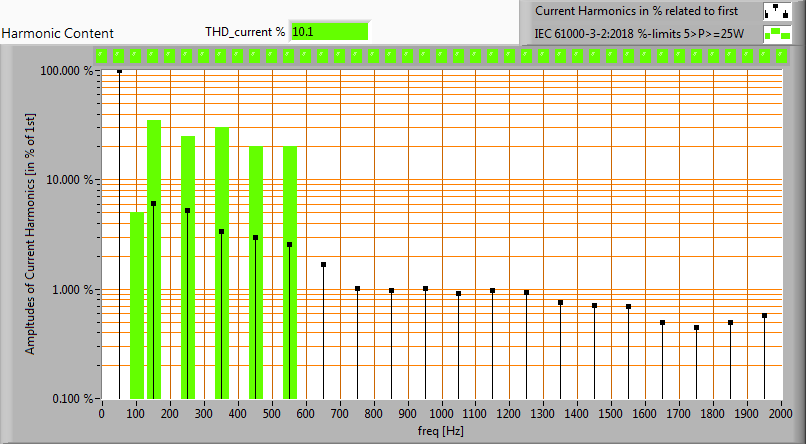 De harmonischen van de stroom vergeleken met maximale waardes in mA per Watt, volgens IEC61000-3-2:2018.