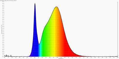 Het kleurspectrum van het licht van deze lamp. Energieniveaus geldig op 1 m afstand.