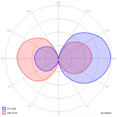 Het lichtdiagram geeft de bundel aan in het C0-C180 vlak (loodrecht op de lengterichting van de lamp) en de bundel in het C90-C270 vlak (in de lengterichting van het lichtgevende oppervlak, gelijk aan in de lengterichting van de lamp).